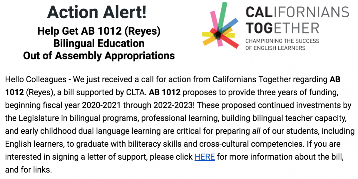 Please sign the letter to let Assembly Member Gonzalez, Chairperson of the Assembly Appropriations Committee know how important this is to our children, schools and communities and the necessity to move off the Suspense File AB 1012 (Reyes) Bilingual and Biliteracy Program Support.